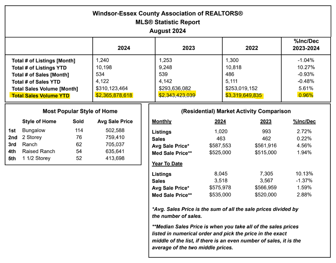 The Windsor-Essex stats hold strong and stable as summer comes to an end. What is interesting to see is the total volume of real estate that has been transacted over the past 3 years from when the market peaked (highlighted in the graphic below). Crazy to think the total value of real estate sold YTD was $1,000,000,000 higher than what it is today!! It’s a positive sign to see a slight increase from 2023.